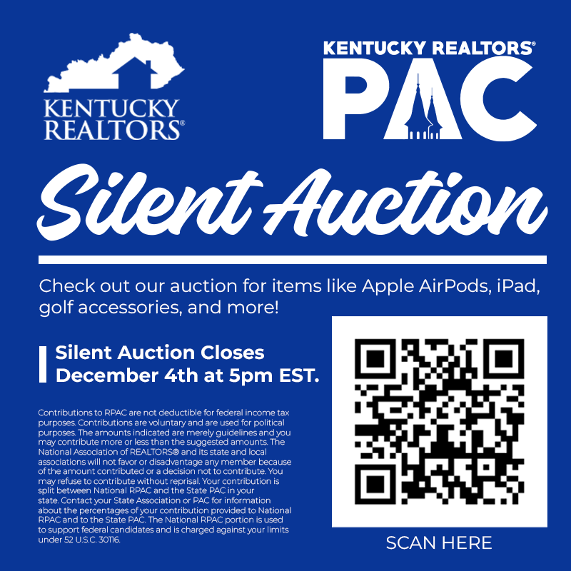 Support your profession and peers by taking part in RPAC's Silent Auction. This auction has Apple AirPods, an iPad, golf accessories and more available for bidding. This RPAC Silent Auction closes December 4th, at 5pm EST. Contributions to RPAC are not deductible for federal income tax purposes. Contributions are voluntary and are used for political purposes. The amounts indicated are merely guidelines and you may contribute more or less than the suggested amounts. The National Association of REALTORS® and its state and local associations will not favor or disadvantage any member because of the amount contributed or a decision not to contribute. You may refuse to contribute without reprisal. Your contribution is split between National RPAC and the State PAC in your state. Contact your State Association or PAC for information about the percentages of your contribution provided to National RPAC and to the State PAC. The National RPAC portion is used to support federal candidates and is charged against your limits under 52 U.S.C. 30116.